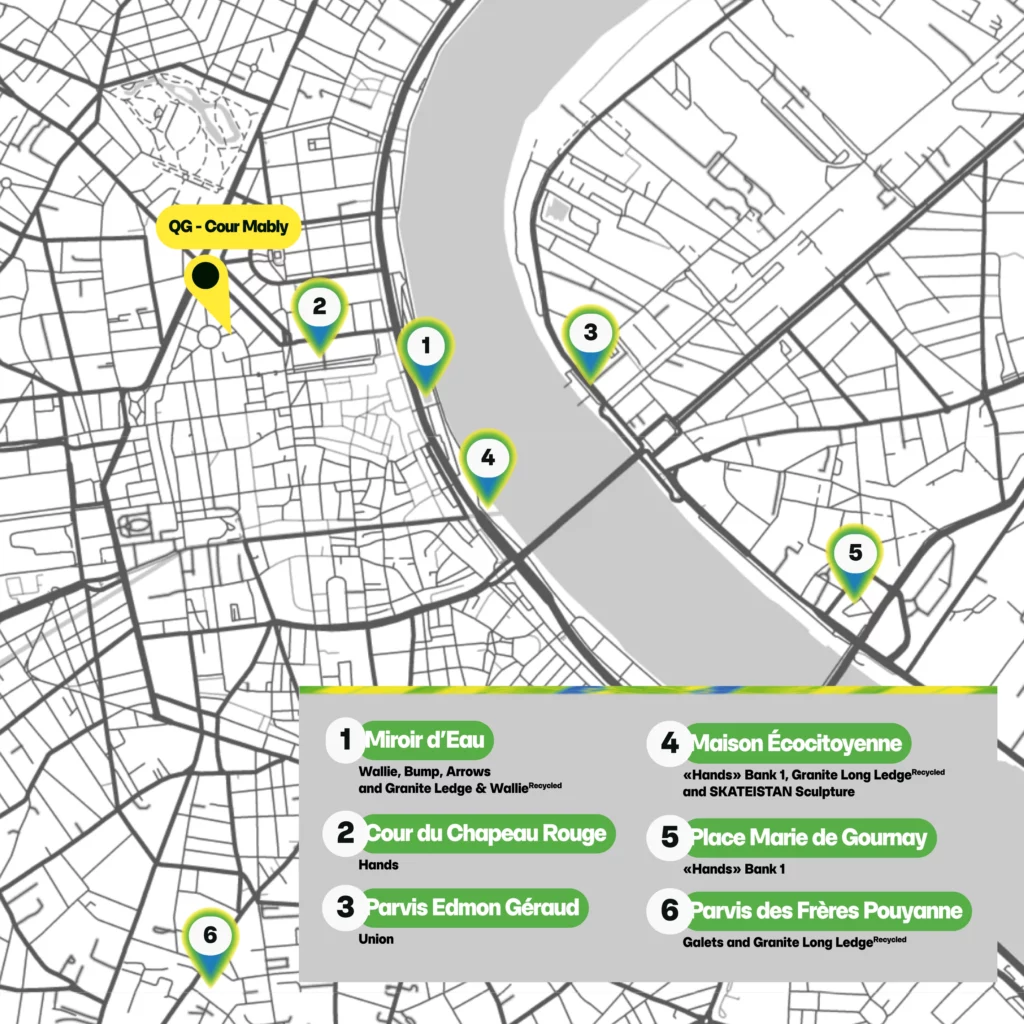 En plus d’offrir de nouveaux éléments skatables sur des spots classiques, son objectif est de valoriser la pratique du skate en Ville auprès des différents publics. En communiquant sur la dimension artistique, urbaine et culturelle du skate, ces sculptures font office de médiation en vue d’un meilleur partage de l’espace public. À vous de les interpréter à votre guise, en skateboard, ou autrement.