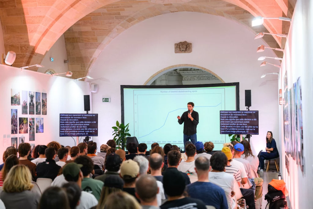 The first panel, presented by Baptiste Pointillart on the history of skateboard in Bordeaux, could not have been a better introduction for this event. Being a historian who doesn’t skate, he brought a different point of view – maybe less affected than a skater’s but therefore more objective –. He saw and underlined such an important and under exploited point being that skaters do accept frames (not to say rules) and can be respectful, but the influence has to come from peers, not through police and repression.